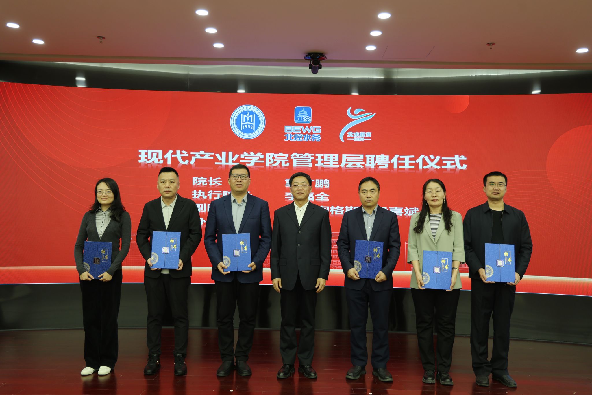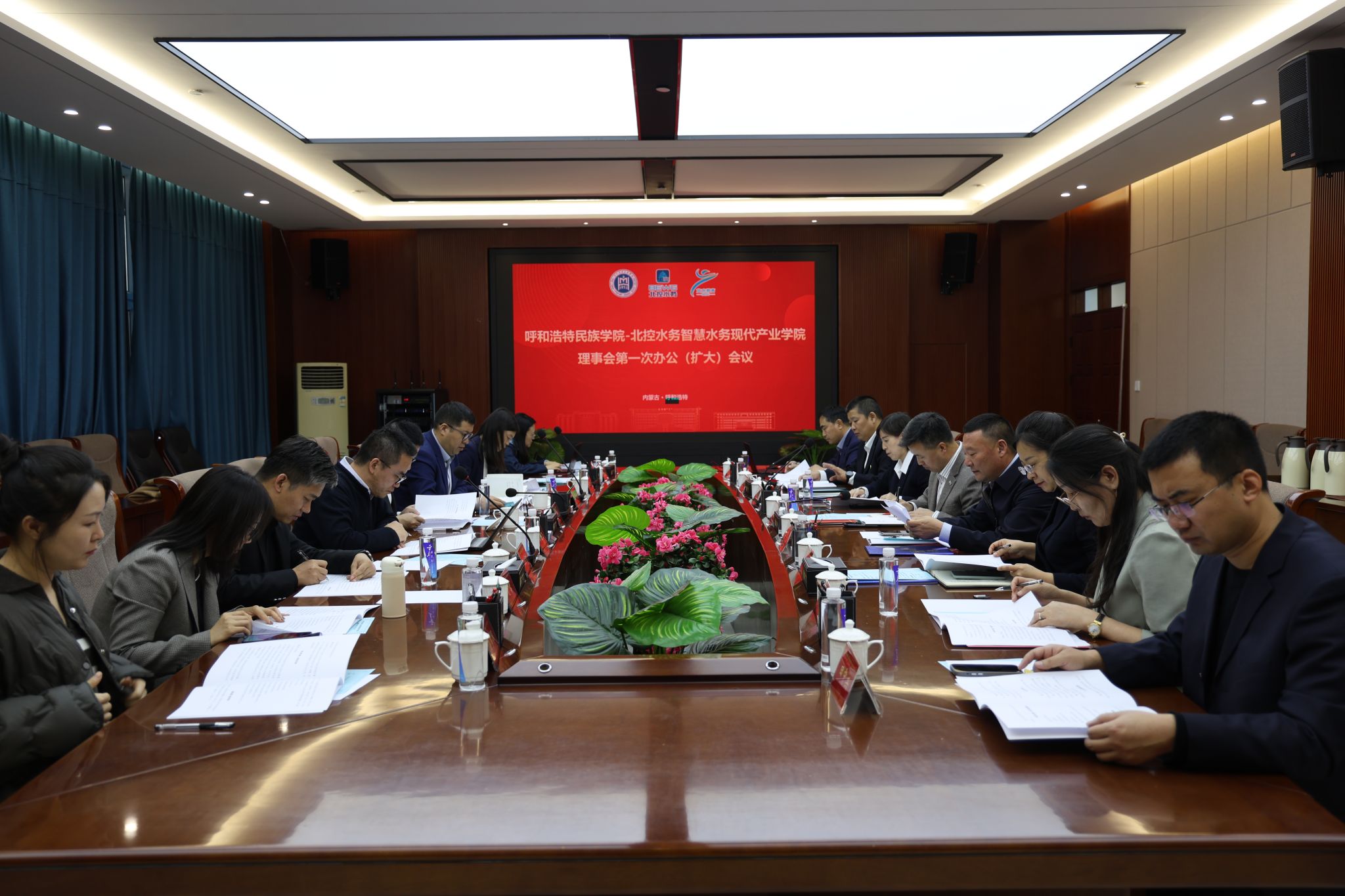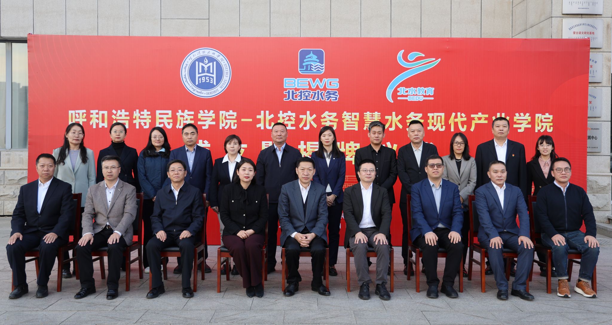 校党委书记刘九万,党委副书记格根哈斯,党委委员、副校长高喜天,党委委员、副校长额尔敦布和,党委委员、副校长双虎,北控水务集团高级副总裁于立国,北水教育中心总经理冀广鹏,北水云服科技有限公司总经理汪力,北控水务研究院院长、北水未来科技有限公司副总经理薛晓飞,运营服务中心总经理助理叶亚琦,北部大区人力资源总监王文岐,北部大区内蒙古业务区总经理殷喜斌,北部大区内蒙古业务区副总经理刘琴 ,北水教育中心产教融合中心总经理秦建明,北水教育中心学习创新中心副总经理孙梦澜出席成立仪式。