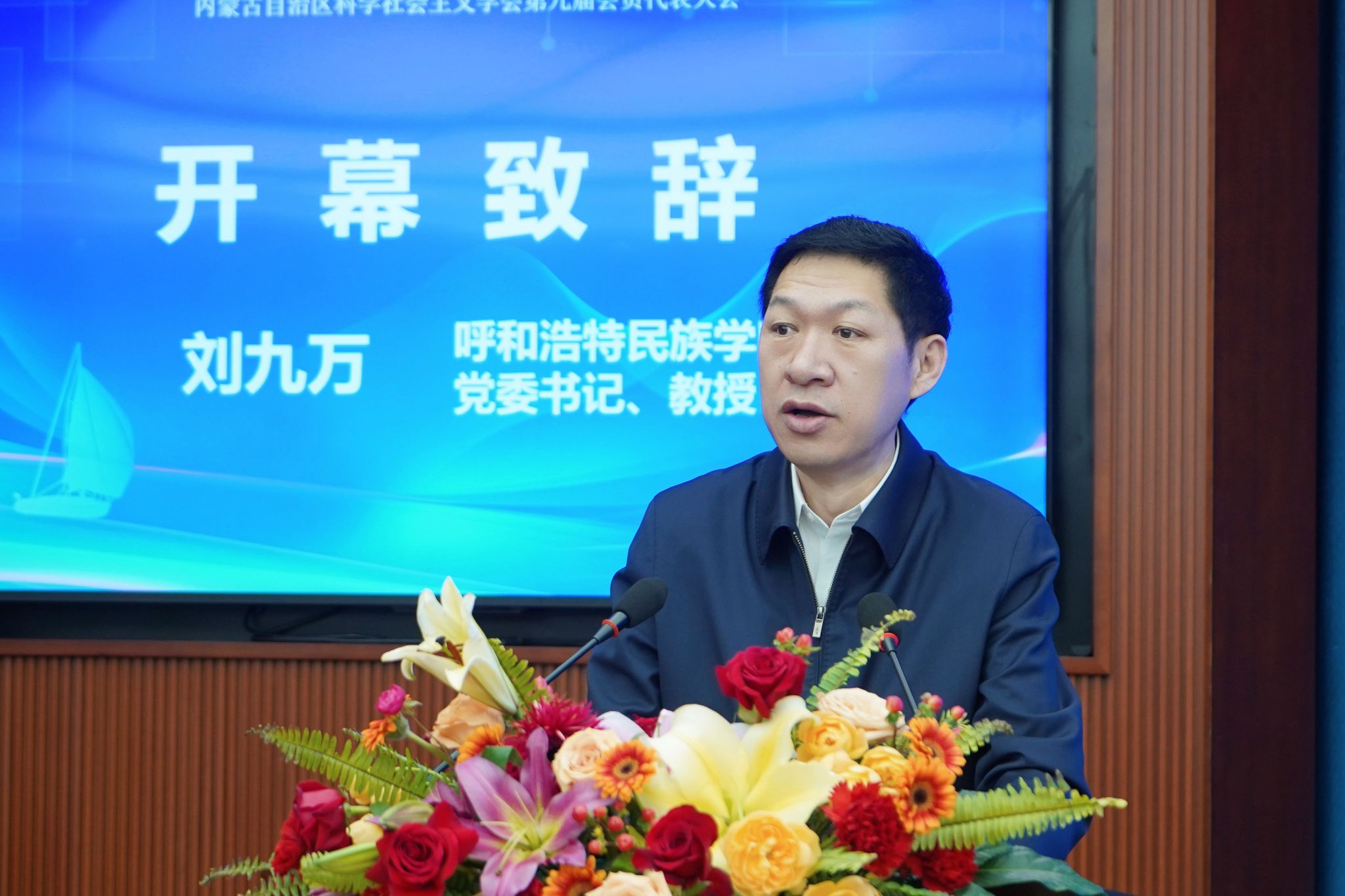 刘九万代表学校全体师生向会员代表和专家学者的到来表示热烈的欢迎,从学校历史沿革、发展历程、办学特色、办学层次,以及以铸牢教育馆为主要载体的贯彻铸牢中华民族共同体意识主线的经验做法等情况作了介绍,并对内蒙古科学社会主义学会进行了简要介绍。
