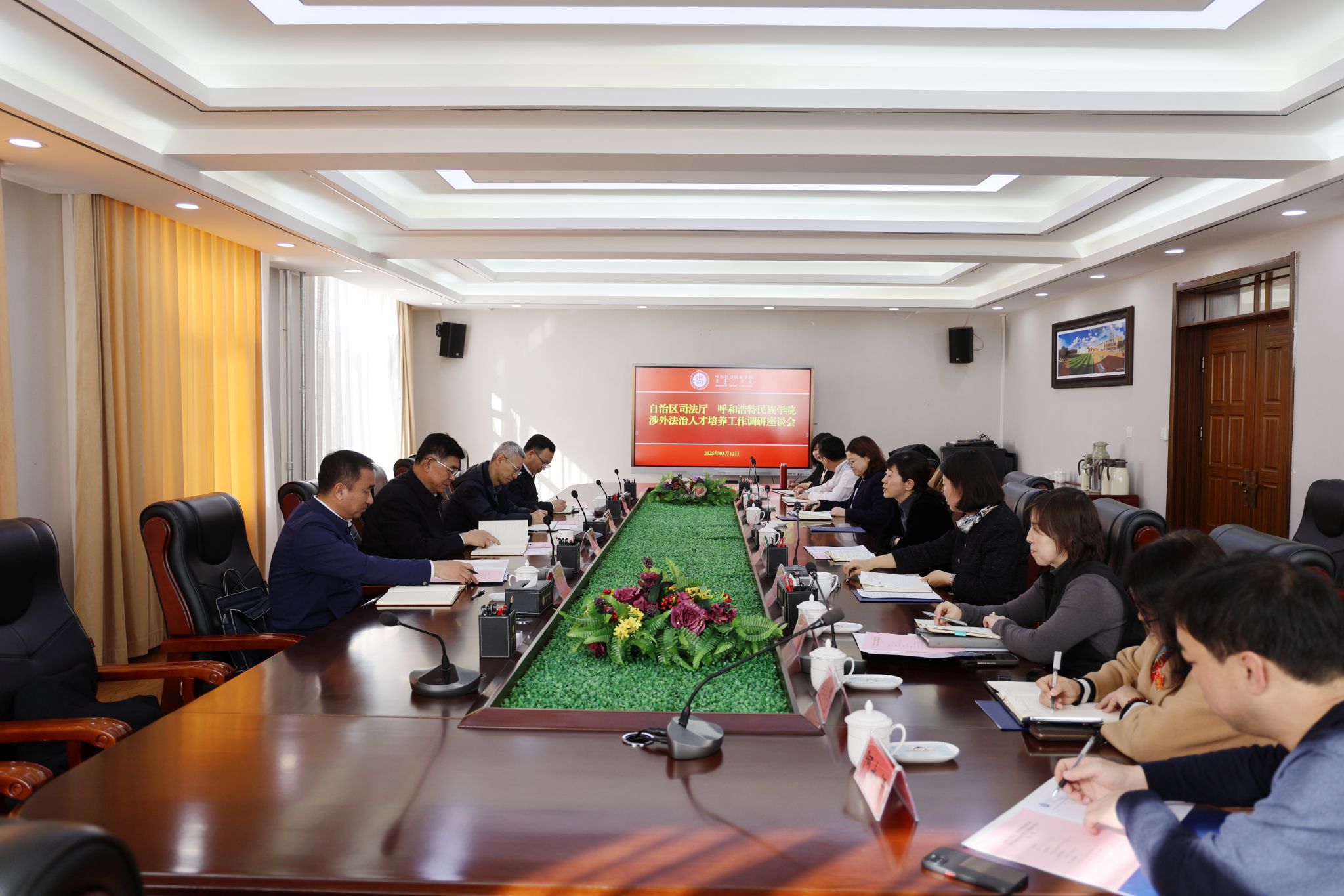 为进一步做好法治人才培养工作,加强法治建设,3月12日,自治区党委依法治区办副主任、司法厅党委书记、厅长白永平,自治区司法厅党委委员、副厅长张生,司法厅相关处室负责人一行来Beat365开展专题调研。会前,校党委书记刘九万会见了白永平一行。党委副书记、校长王敏,党委副书记格根哈斯与白永平一行座谈交流。