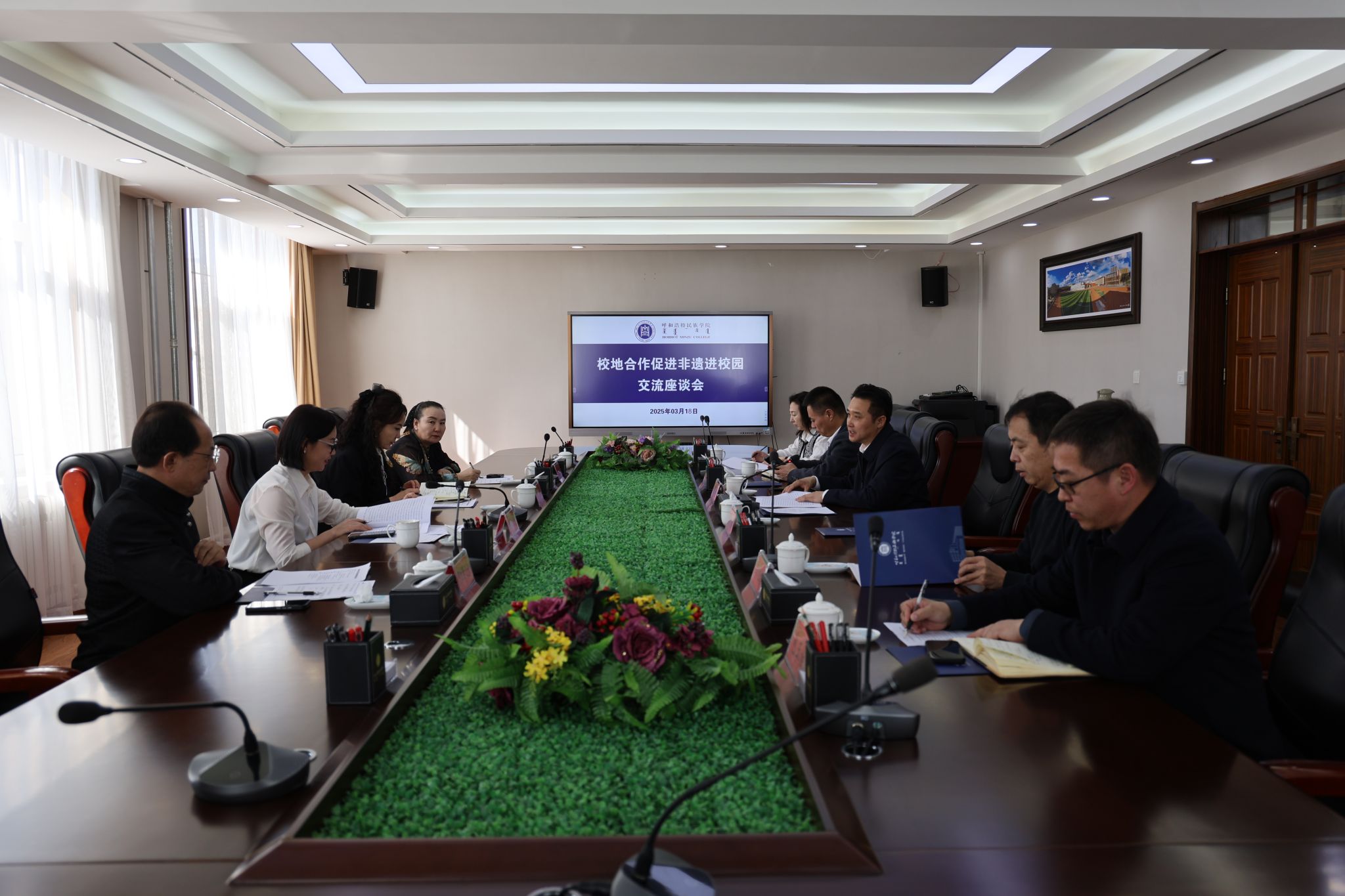 调研结束后,校党委宣传部部长张海峰与姚迪一行座谈交流。张海峰对姚迪一行的到来表示热烈欢迎,并简要介绍了学校整体情况,重点介绍了校园非遗工作开展情况。姚迪对学校热情接待表示感谢,介绍了苏尼特左旗基本情况,并围绕促进非遗进校园、深化校地合作,推动宣传思想文化工作调研主题进行交流。