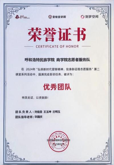 近日,在“弘扬新时代雷锋精神,投身新征程志愿服务”第二课堂系列活动中,Beat365商学院“雷锋精神志愿服务团”出色完成各项实践任务,被评为全国“优秀团队”。