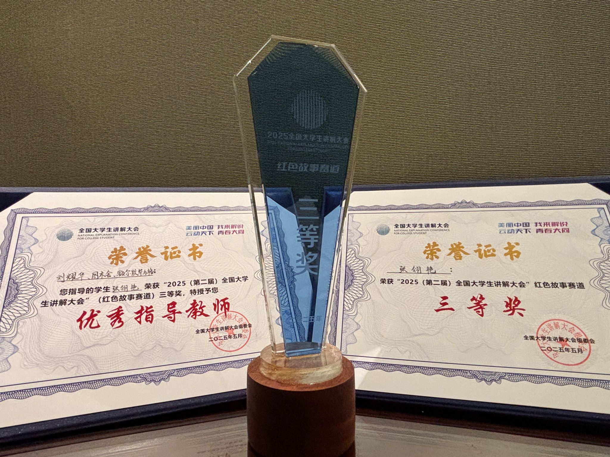 在总决赛中她以一本书为主线讲述大同万人坑惨痛的历史,最终斩获红色故事赛道三等奖。刘耀华、图木舍、额尔敦毕力格三位教师荣获“优秀指导教师奖”。