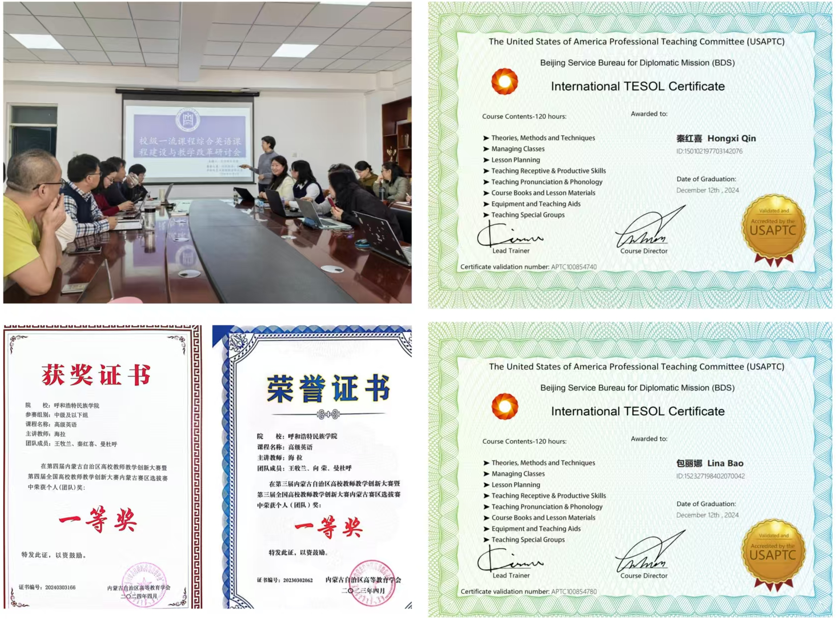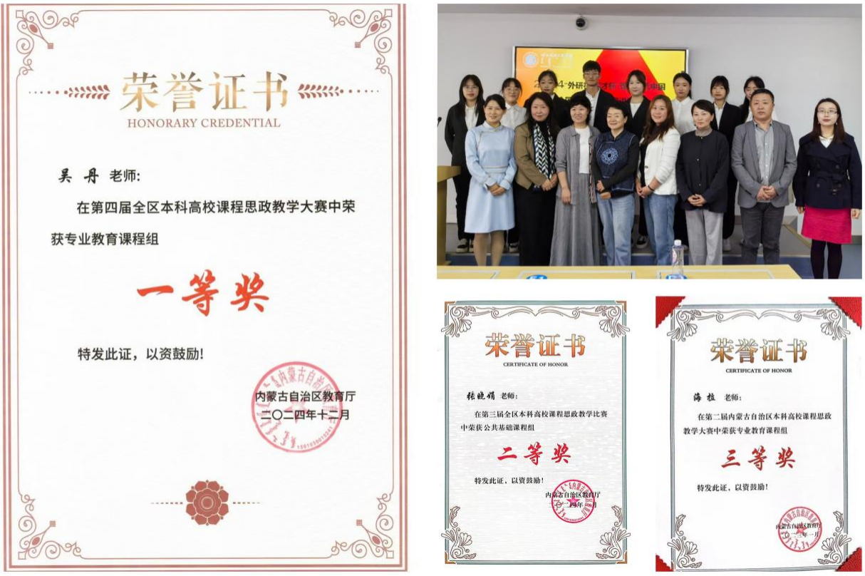 学院教师在各级各类教学赛事中表现卓越,屡创佳绩。在教学创新赛方面,《高级英语》课程团队在第三、四届内蒙古自治区高校教师教学创新大赛中连续夺冠。在课程思政大赛中,获自治区三等奖1次,二等奖2次,一等奖1次,且成绩逐年提升。学院组织全体英语教师参与TESOL考试,通过系统培训与认证,教师教学方法、课程设计及课堂管理等方面的能力获得全方位提升。