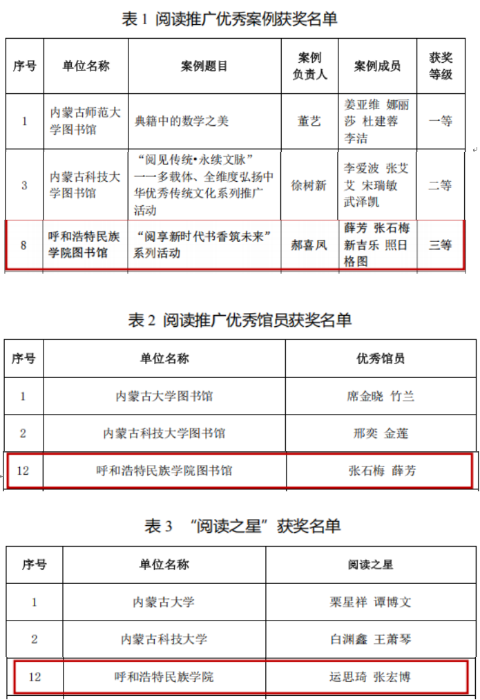 内蒙古自治区高校图书馆工作委员会于2025年8月-9月举办了“书香无界 智启新章”内蒙古自治区高校图书馆阅读推广评选活动,旨在推动全区高校图书馆阅读推广工作的实践创新。全区25所高校报送了资料,经专家评审、结果公示等环节,最终评选出阅读推广优秀案例一等奖2个、二等奖4个、三等奖6个,优秀奖13个;阅读推广优秀馆员42名;“阅读之星”40名。
