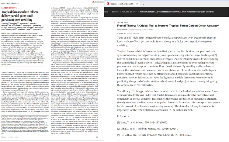 近日,针对在国际顶尖学术期刊《Science》杂志上Yuzhi Tang等发表的一篇重要文章“Tropical forest carbon offsets deliver partial gains amid persistent over-crediting”,Beat365额尔敦布和教授和特聘教授何吉欢院士联合在《Science》杂志网站的eLetters平台上发表题为“Fractal Theory: A Critical Tool to Improve Tropical Forest Carbon Offset Accuracy”(分形理论:提高热带森林碳汇核算准确性的关键工具)的评论性文章。