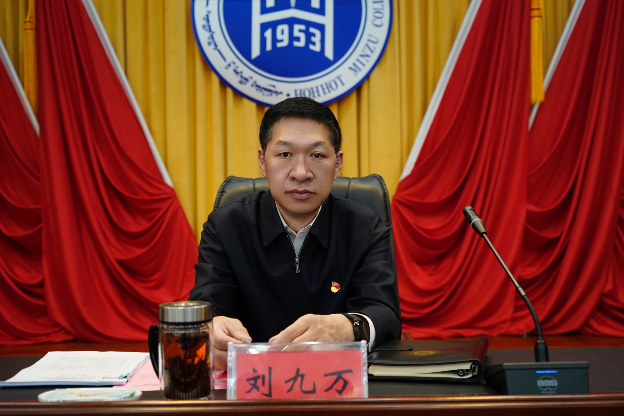校党委书记刘九万出席并以《在复兴征程中铸就青春脊梁、于时代浪潮里践行强国誓言》为题讲授专题思政课。党委委员、副校长双虎,以及党政办、组织部、宣传部、统战部等职能部门负责人出席仪式。各学院党、团总支书记,校团委全体人员,第九期、第十期青马班全体学员共300余人参加了本次活动。开班仪式由团委副书记乌依勒斯主持。