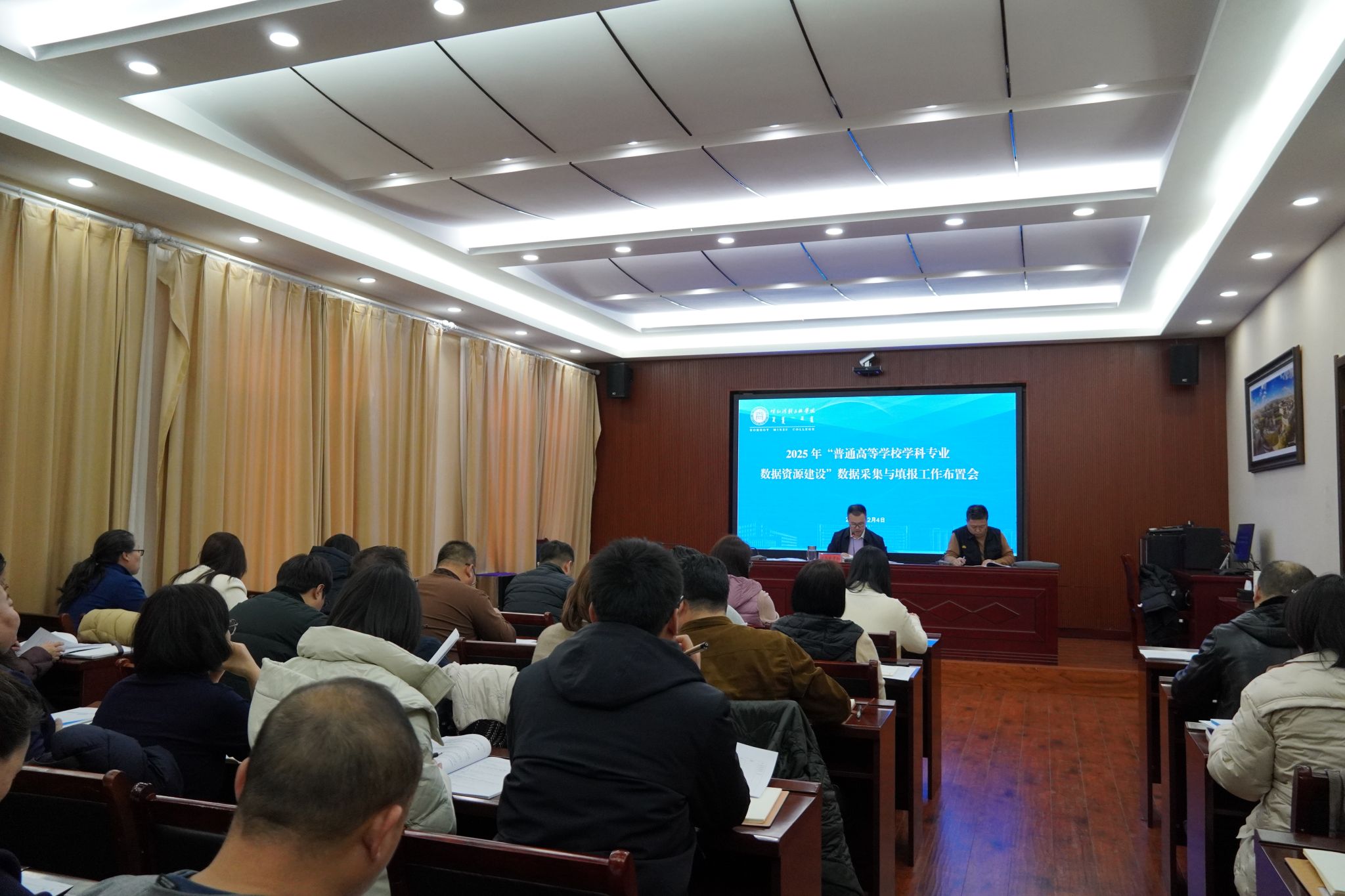 12月4日,学校在办公楼四楼会议室召开了2025年“普通高等学校学科专业数据资源建设”数据采集与填报工作布置会。会议由校党委委员、副校长额尔敦布和主持。