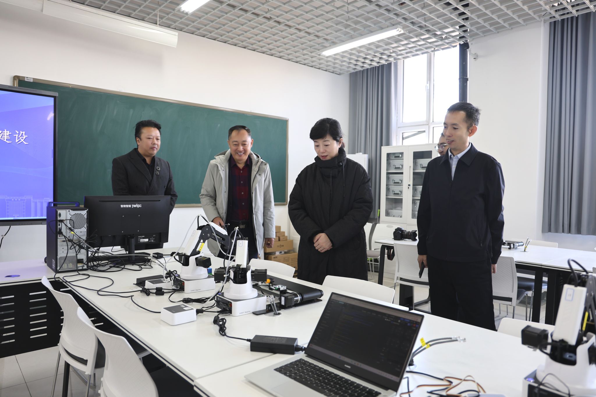 在智能科学学院调研时,王敏深入机器人工程实训室,详细了解实训室仪器设备配置及支撑课程等,现场观摩智能机械臂机器人实训项目演示,听取智能科学学院关于实训室建设及未来规划的汇报。王敏对智能科学学院在专业建设、科研成效、党建及学生管理等方面的工作给予充分肯定。她指出,结合 “十五五”规划编制工作,科学谋划智能科学学院高质量发展路径,立足国家与自治区人才需求,动态优化人才培养方案,积极探索校企协同育人新机制,赋能学校转型提质,为培养高水平应用型人才奠定坚实基础;拓宽引才渠道,通过 “走出去精准对接 ” 强化高层次人才引进,优化充实师资队伍;以学科建设为引领,深化有组织科研,打破学院与专业壁垒,依托学校院士工作站、产业学院等平台资源,聚力打造特色鲜明、优势突出的科研高地。会上智能科学学院院长宁宏亮等班子成员围绕各自工作领域进行工作汇报。