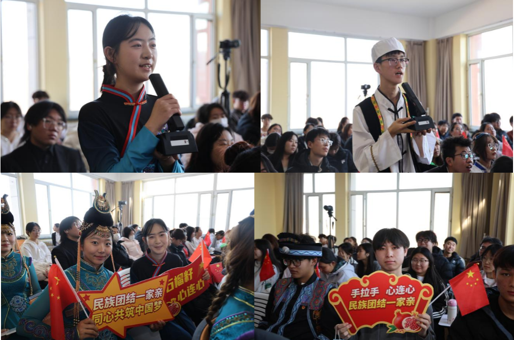 分享会上,来自纳西族、水族、达斡尔族、土家族、朝鲜族的五名同学以温情讲述、多元互动为载体,分享了本民族的文化习俗,讲述了在校园生活中与各民族同学互帮互助、同心筑梦的民族团结故事。她们运用真挚的话语、鲜活的事例分享了“中华民族一家亲、同心共筑中国梦”的感人故事,引发全场师生强烈共鸣。活动期间,学校大学生艺术团以舞蹈《草原赞歌》为现场增添了热烈的民族团结氛围。