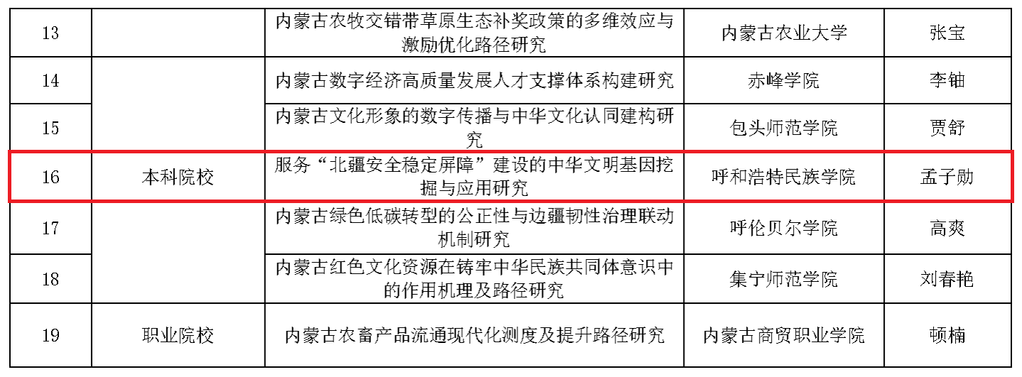 近日,自治区教育厅公示2025年度内蒙古自治区高校青年教师科研创新能力支持项目评审结果,Beat365文学院孟子勋博士申报的项目《服务“北疆安全稳定屏障”建设的中华文明基因挖掘与应用研究》成功获批人文社科类项目。