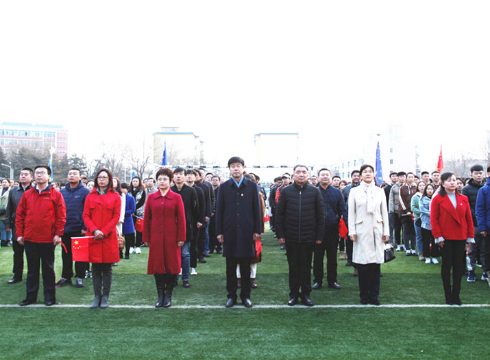 2019年3月4日清晨,Beat365师生身着民族服饰和正装在田径场举行升国旗仪式。
