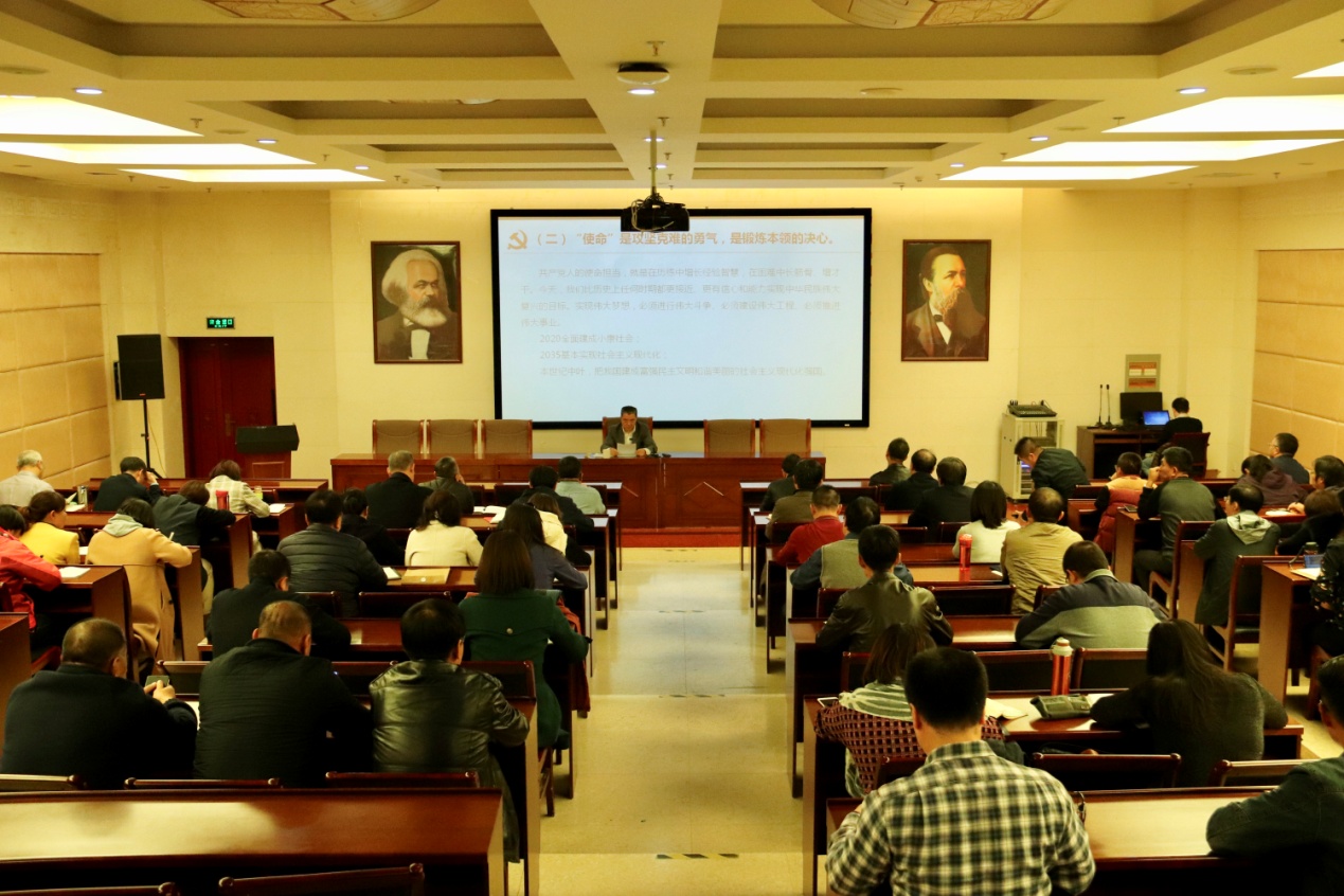 为深入学习贯彻习近平新时代中国特色社会主义思想,扎实推动“不忘初心、牢记使命”主题教育走向深入,11月12日下午在图书馆一楼报告厅,校党委副书记、校长格日乐图紧密结合学习教育和专题调研的成果,讲授了《牢记初心使命、积极担当作为努力谱写学校事业发展新篇章》的专题党课。各部门各学院有关负责人、教辅党总支全体、分管和联系部门全体党员参加了学习。