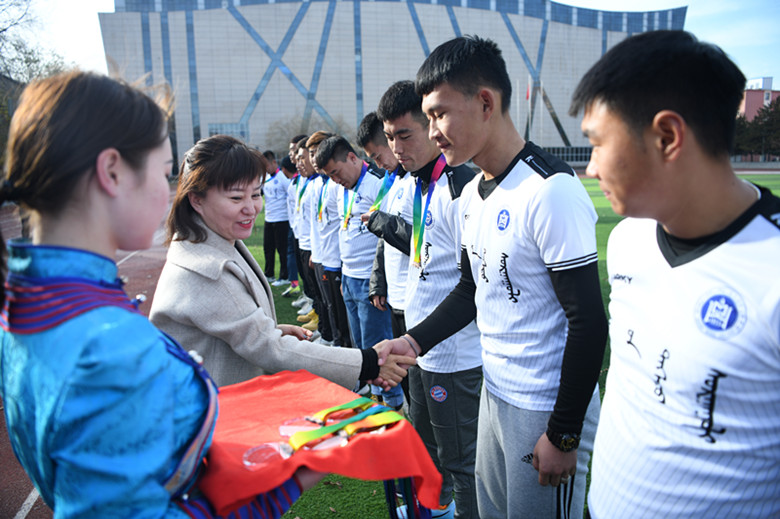 校团委副书记苏伦高娃为季军队员颁发奖牌