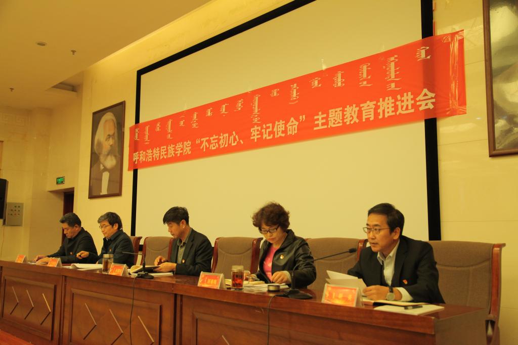 为进一步深入贯彻落实习近平总书记关于主题教育的重要讲话、重要指示精神,贯彻落实中央和自治区第二批主题教育推进会精神,经报请自治区第二批主题教育第九巡回指导组同意,10月17日下午,学校在学习大讲堂召开“不忘初心、牢记使命”主题教育推进会。校党委书记孙国权,党委副书记胡春梅,党委委员、副校长阿拉坦仓,党委委员、副校长贺希格吉雅,党委委员、纪委书记朝克出席会议,副处级以上干部、各党支部书记参加会议。会议由学校主题教育领导小组副组长、纪委书记朝克主持。