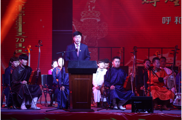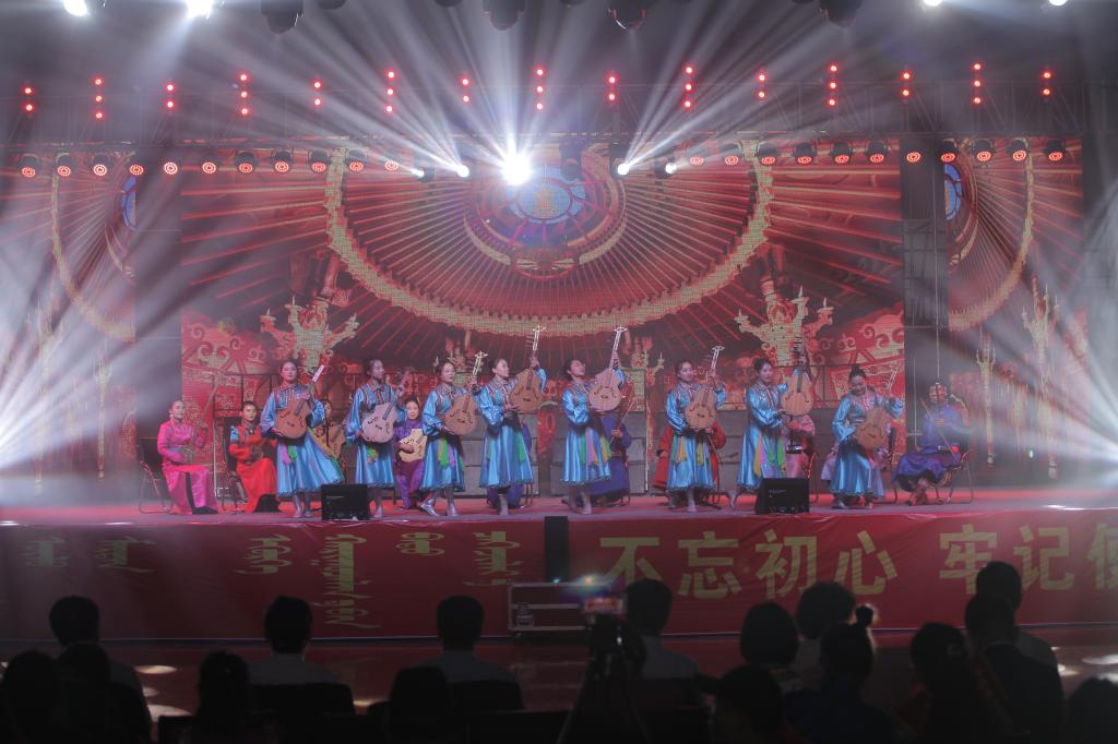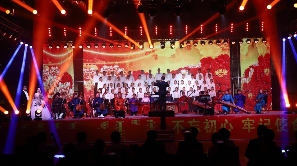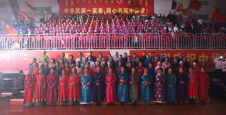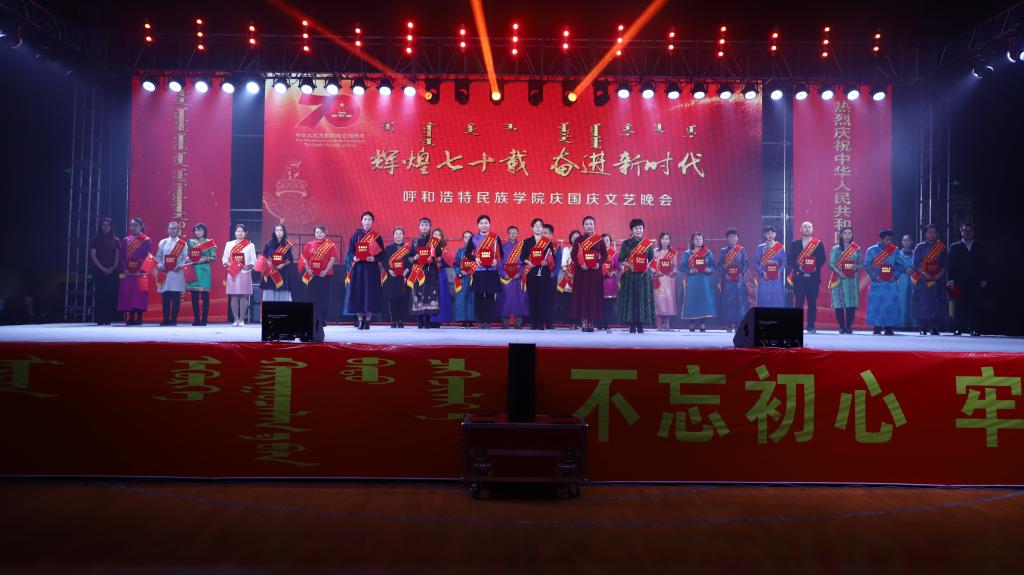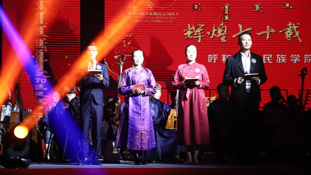 随着《赞歌》激昂的旋律响起,拉开了整场晚会的帷幕。《“新思想”赞》《我爱你中国》《祖国,慈祥的母亲》《七十年的阳光》《歌唱祖国》等曲目,用好来宝、齐唱、混声合唱、重唱等多种演唱形式,表白了民院师生对伟大祖国的无比热爱之情。民乐合奏《梦中的草原》、马头琴齐奏《初升的太阳》、合唱《美丽的草原我的家》、舞蹈《问候》,歌颂了绿色的大草原、壮美的内蒙古。大合唱《各族人民心连心》、独唱《阳光路上》、笛子齐奏《策马扬鞭运粮忙》、古筝齐奏《战台风》、舞蹈《马背蓝印》,表达了民院师生在习近平新时代中国特色社会主义思想指引下,民族团结一家亲、同心共筑中国梦的坚定决心。整场演出高潮迭起,师生激情澎湃,始终洋溢着感恩党情、讴歌祖国和催人奋进的主旋律。