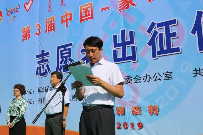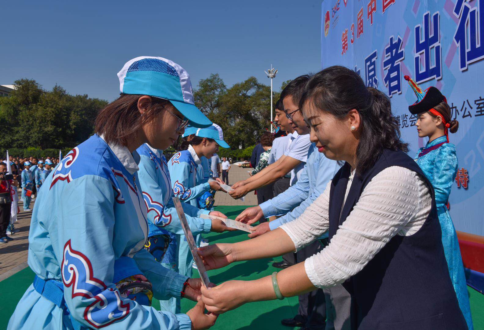 最后,第三届中蒙博览会综合协调部执行副部长、自治区商务厅厅长田永为青年志愿者服务队授旗。