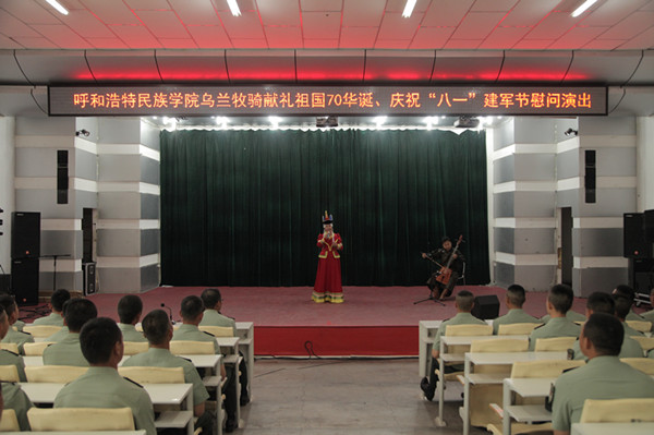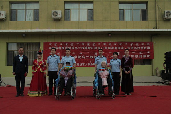 在乌拉特后旗某驻军部队,邀请两名参加抗美援朝的老兵庆祝“八一”建军节,精彩的节目和官兵的表演勾起90多岁老人对峥嵘岁月的追忆,乌兰牧骑队员为老兵献上哈达和崇高的敬意,引发观众共鸣,在场官兵和演职人员无不为之感动。