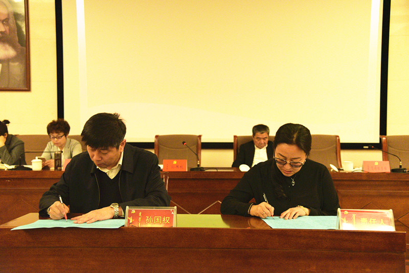 为推动各项工作责任制落实,会上进行了“责任状”签字仪式。孙国权书记分别与校领导、各单位各部门负责同志代表签订了“一岗双责”、党建、意识形态、党风廉政建设、综合治理、保密等工作责任状,格日乐图校长与各单位各部门代表签订了消防安全工作责任状。