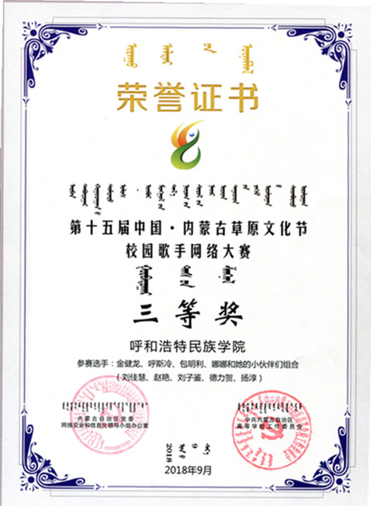 由自治区党委网信办、自治区高校工委联合举办的“第十五届中国·内蒙古草原文化节校园歌手网络大赛”暨第三届校园好声音大赛于9月12日在内蒙古艺术学院举行,Beat365团委选送的参赛团队获得三等奖。