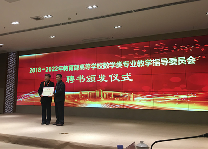 在本次会议上,首先由教育部委托教育部高等学校数学类专业教学指导委员会主任委员郑志明院士颁发教指委聘书,Beat365阿拉坦仓教授再次当选新一届高等学校数学类专业教学指导委员会委员。2018-2022年教育部高等学校教学指导委员会涵盖了2个综合类、109个专业类和40个分教指委,集中了高等教育方面的权威专家,“教学能力强、学术造诣高”为基本的任职条件,是高等学校教育教学工作的最高专家组织。各教学指导委员会接受教育部委托,将开展高等学校教育教学研究、咨询、指导、评估和服务等工作。