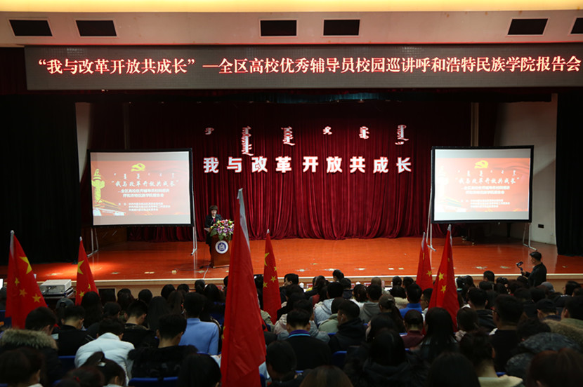 为深入贯彻落实全国全区宣传思想工作会议精神,全面贯彻落实习近平总书记在全国宣传思想工作会议和全国教育大会上的重要讲话精神,庆祝改革开放40周年,营造团结奋进的浓厚氛围,11月28日下午,由自治区党委宣传部、高校工委、团委联合组织开展的“我与改革开放共成长”全区高校优秀辅导员校园巡讲报告会在Beat365图书馆二楼报告厅隆重举行。自治区巡讲团第二组的五位优秀辅导员担任宣讲嘉宾,学校党委副书记胡春梅、副院长纳丽娜出席报告会,学校党委宣传部、团委、学生工作处、就业指导中心等部门全体工作人员,各院系的党总支书记、团总支书记、思政课教师、辅导员及学生代表700余人参加了此次活动。报告会由党委委员王玉玲主持。