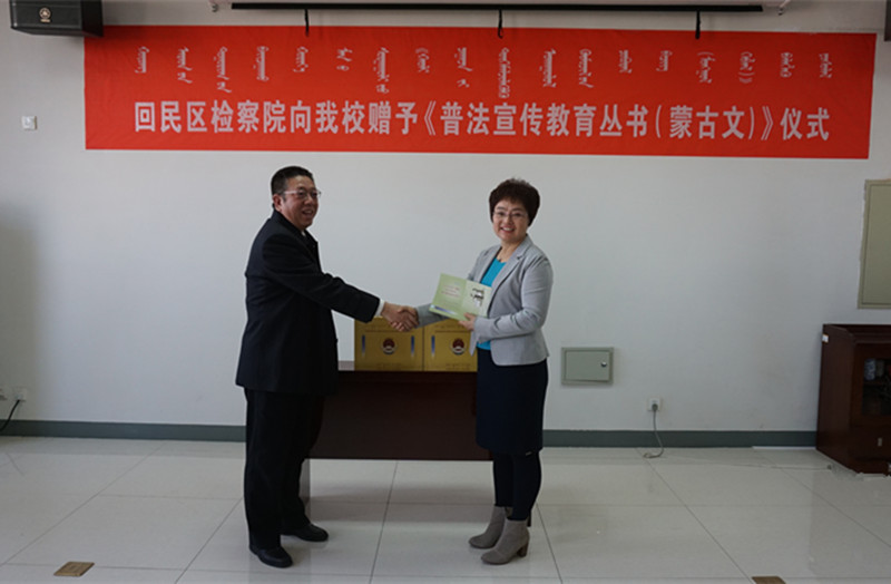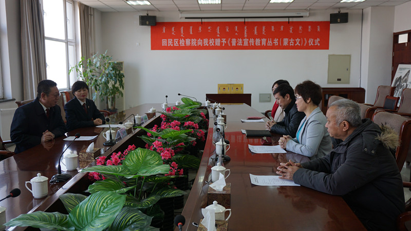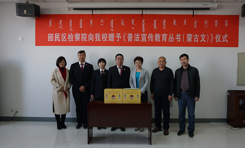 为普及法律知识,加强七五普法教育,增强法制观念,提高Beat365师生学法、尊法、守法、用法能力,11月15日上午,回民区检察院副检察长刘中、检察官金燕翔等一行四人来Beat365开展“蒙文普法丛书送书”活动。学校党委副书记胡春梅、宣传部部长巴图吉日嘎拉、图书馆馆长齐根锁、法律系副主任胡春香参加仪式。