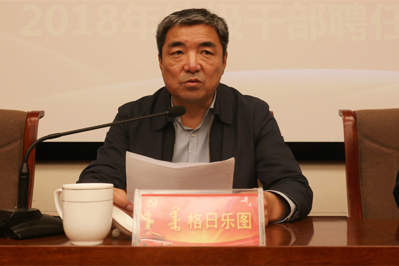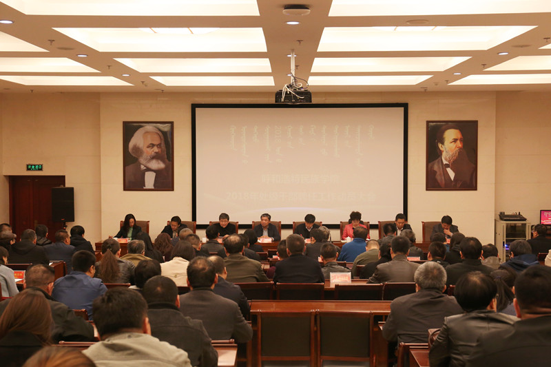 10月23日下午,学校在图书馆一楼报告厅召开了2018年处级干部聘任工作动员大会。校党委书记孙国权,党委副书记、校长格日乐图,党委副书记胡春梅,党委委员、副校长阿拉坦仓,党委委员、副校长贺希格吉雅,党委委员、纪委书记朝克,党委委员、组织统战部部长包君,党委委员、纪委副书记、监审处处长王玉玲出席会议。会议由党委副书记、校长格日乐图主持。
