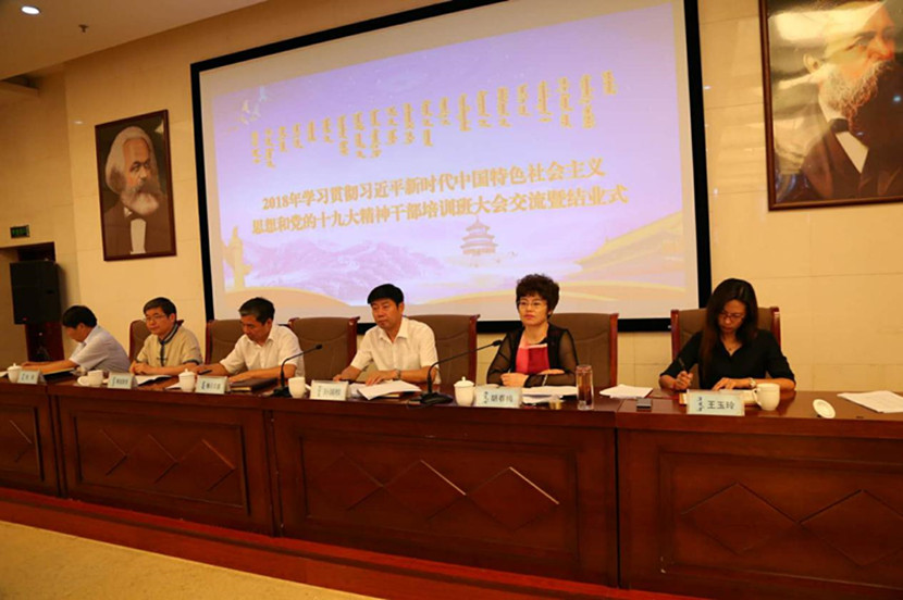 8月31日下午,学校党委在图书馆一楼报告厅举行“2018年学习贯彻习近平新时代中国特色社会主义思想和党的十九大精神干部培训班”结业式。学校党委书记孙国权、院长格日乐图、党委副书记胡春梅、副院长阿拉坦仓、党委委员包君、党委委员王玉玲出席大会,党委副书记胡春梅主持,处级、科级干部共136人参加了本次结业式。