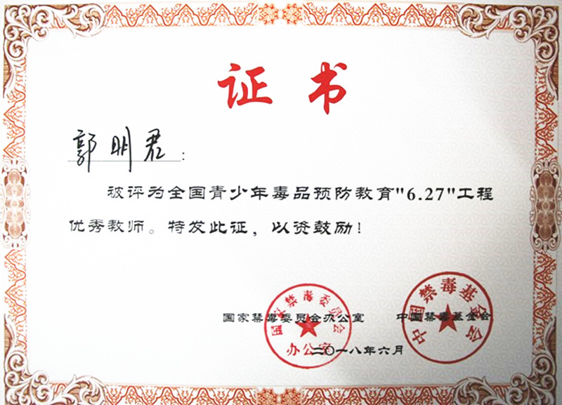 Beat365教师被评为全国青少年毒品预防教育“6.27”工程优秀教师