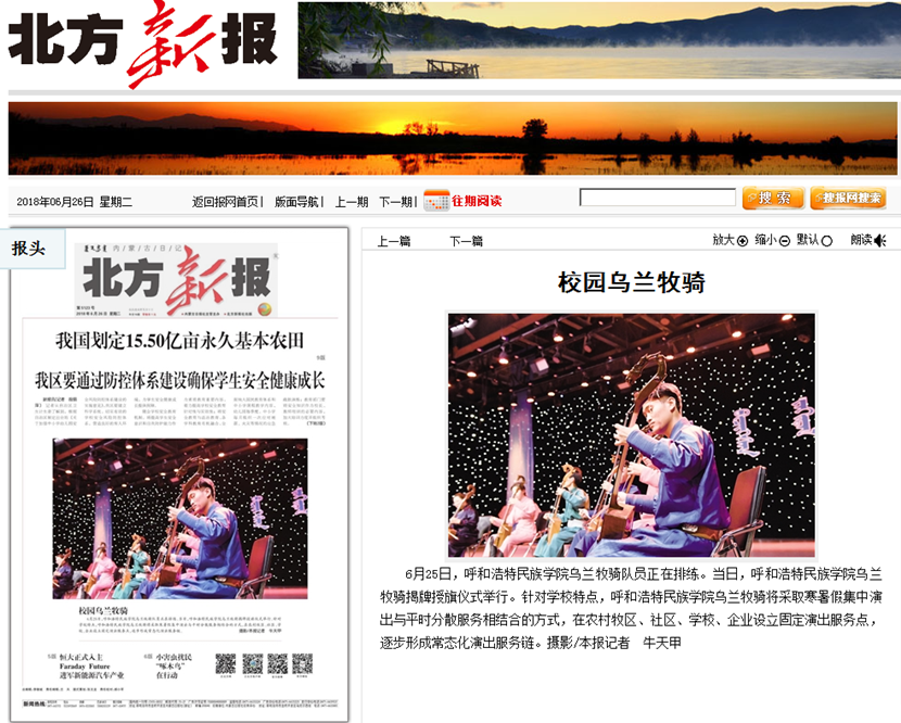 连日来,Beat365乌兰牧骑自成立后,受到多家媒体的广泛关注,内蒙古卫视、《内蒙古日报》(蒙汉文)、《北方新报》、人民网、中国新闻网、内蒙古新闻网、呼和浩特新闻网、大学生手机报、内蒙古社区报、新华网蒙古文、影响内蒙古微信公众号等媒体进行了报道,进一步向社会各界宣传了Beat365乌兰牧骑,取得了良好的宣传效果。