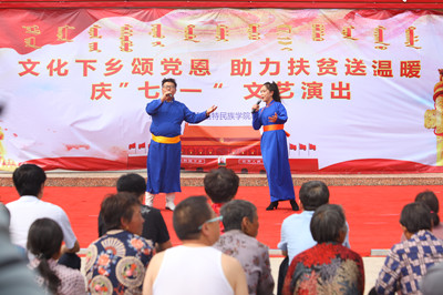 7月1日校党委书记孙国权、副书记胡春梅、副校长阿拉坦仓、党委委员王玉玲带领学校乌兰牧骑队员和部分干部赴Beat365扶贫点化德县长顺镇昔尼乌素村开展了庆“七一”演出、主题党日、精准扶贫系列活动。孙书记一行首先与化德县领导、长顺镇、昔尼乌素村干部就做好扶贫点扶贫工作进行了深入的座谈交流,接着学校乌兰牧骑临时党支部与昔尼乌素村党支部开展了“我们一起为党过生日,‘五个一’主题党日活动”,两个支部全体党员通过共同听一次党课、唱一首党歌、重温一次入党誓词、慰问一批老党员、进行一次座谈交流等“五个一”活动为党过生日,共同庆祝中国共产党成立97周年。学校乌兰牧骑以“文化下乡颂党恩,助力扶贫送温暖”为主题为昔尼乌素村送上了一场精彩的庆“七一”文艺演出,并为村民分发了精心编印的《党的政策宣传口袋书》,深入宣传习近平新时代中国特色社会主义思想、十九大精神和党的扶贫政策。孙书记一行还看望了学校通过养殖项目精准资助的四户贫困户,并请养殖技术人员为他们做技术培训。本次活动是Beat365唯一官方网站乌兰牧骑成立后首场校外演出和政策宣传,也是学校党委助推自治区扶贫攻坚行动的有力举措。本次活动受到了化德县领导的高度重视和昔尼乌素村村民的高度评价。同时也得到新闻媒体的高度关注,内蒙古新闻联播、乌兰察布市和化德县电视台新闻栏目均作了报道。