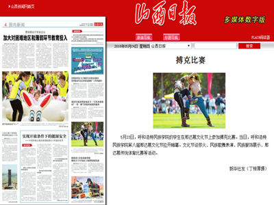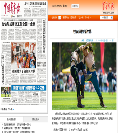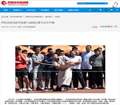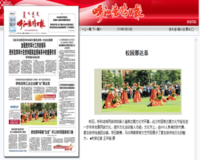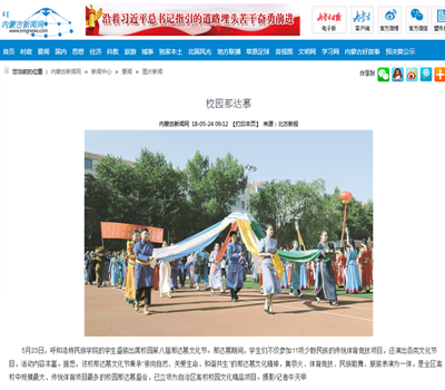 经学校党委宣传部的大力推广和团委、网络中心、保卫处、后勤管理处、体育系等部门的协助,本次那达慕文化节的媒体宣传工作实现了历史性突破。截止到5月28日,共有30家新闻媒体进行了专题报道,媒体覆盖广度和宣传报道力度是建校以来之最。其中,《中国日报》(英文名称《China Daily》,全球发行,期均90余万份)在显要位置以图片新闻报道;《中国青年报》《内蒙古日报》(蒙古语、汉语版)《呼和浩特日报》《北方新报》《呼和浩特晚报》《内蒙古晨报》7家报纸媒体进行了头版报道,《内蒙古日报》(蒙古语版)整版报道;内蒙古卫视2个电视频道,新华社、人民网、光明网、新华网、中国新闻网等11家网站,中央人民广播电台、中国蒙古语广播电台、内蒙古广播电台蒙古语频道、呼和浩特新闻广播等3家电台,影像内蒙古、北疆大学生、内蒙古客户端、内蒙古日报等4家主流微信公众号进了报道;新浪网、网易网、中国民族宗教网、《山西日报》等仅百余网站、媒体进行了转载报道。