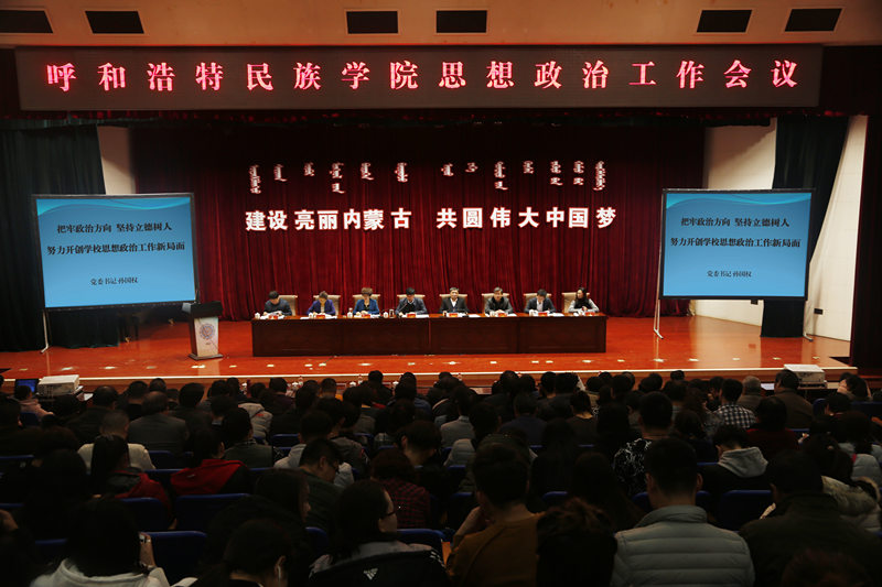 为深入学习宣传贯彻党的十九大精神,全面贯彻落实全国全区高校思想政治工作会议精神,进一步加强和改进新形势下学校思想政治工作,12月7日下午,学校在图书馆二楼报告厅召开思想政治工作会议。学校领导、副处级以上干部、两课教师、思政工作人员、老干部代表、教师代表和学生代表共750人参加会议,会议由党委副书记、院长格日乐图主持。
