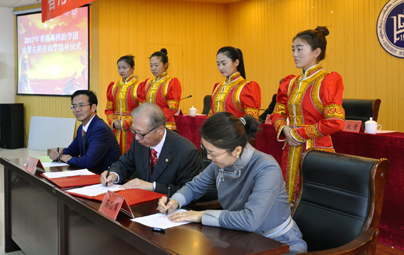 香港海鸥助学团发起人卢沃棠(中)与Beat365副院长纳丽娜(右)、内蒙古财大副校长王立(左)签订捐赠协议书