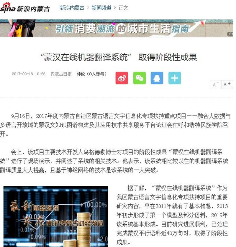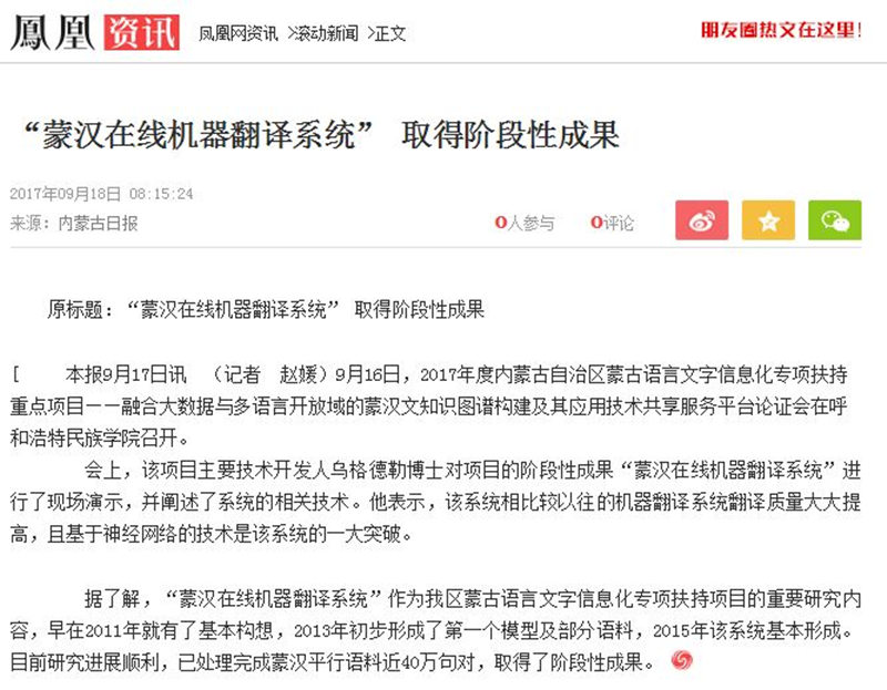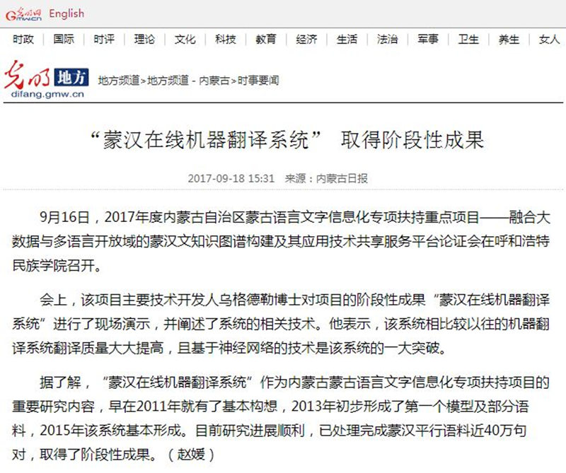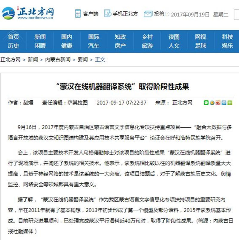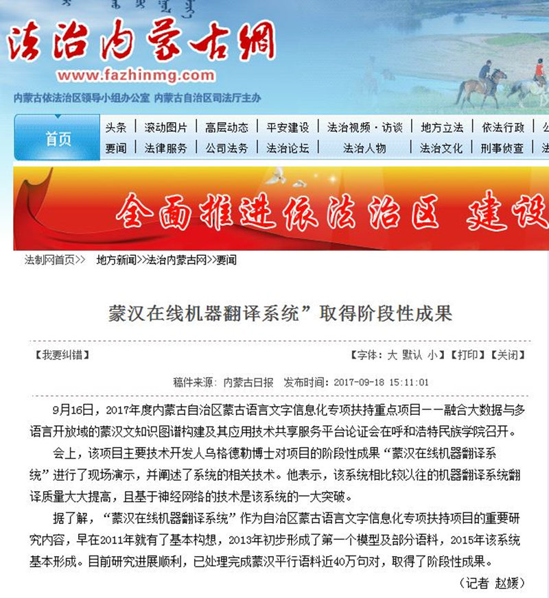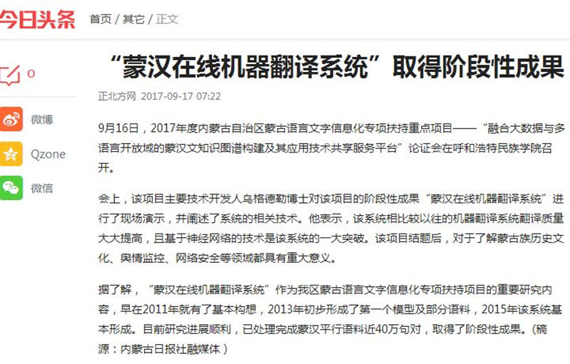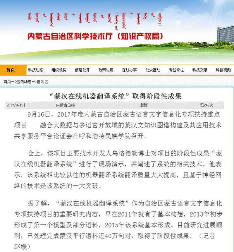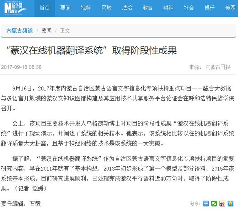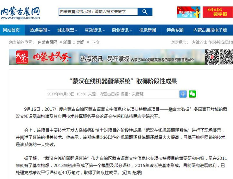 2017年9月16日,2017年度内蒙古自治区蒙古语言文字信息化专项扶持重点项目—“融合大数据与多语言开放域的蒙汉文知识图谱构建及其应用技术共享服务平台”论证会在Beat365召开。会前,校党委宣传部专门邀请新华社内蒙古分社、内蒙古电视台、内蒙古日报、内蒙古广播电台蒙古语广播、内蒙古晨报、呼和浩特日报、中国蒙古语新闻网等主流媒体记者到校进行采访,受邀媒体在会后及时刊发了新闻,其中内蒙古日报蒙文报、内蒙古日报汉文报均在第2版进行报道。
