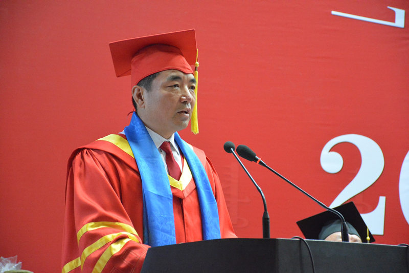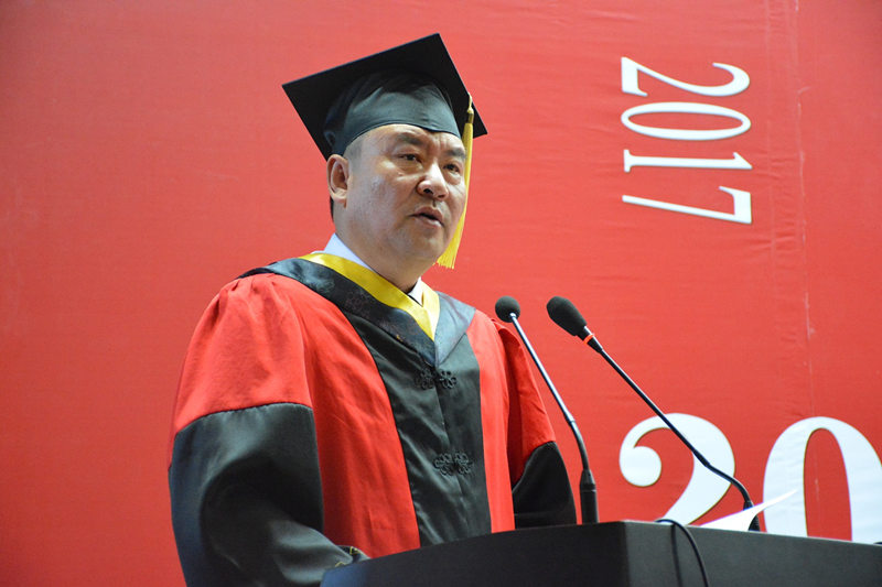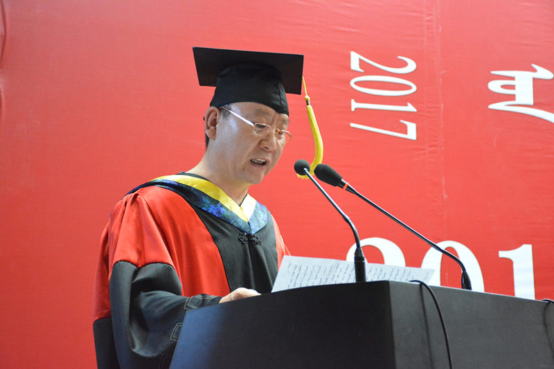 师生代表发言结束后,格日乐图院长殷切致辞,为毕业生上了最后一堂课。他首先代表全体师生员工,向圆满完成学业的全体毕业生表示热烈的祝贺和诚挚的祝福,向悉心指导和培育的老师们及关心关爱的父母家人表示感谢。格院长表示,2017届毕业生在四年的学习生涯中勤奋学习、勇创佳绩,为学校发展的史册再添夺目篇章。格日乐图院长希望各位毕业生胸怀梦想、修身养德、勇往直前,希望考取研究生的同学们继续发扬拼搏精神、优良作风、时代精神。同时祝愿学生珍惜昨天的态度,放飞今天的梦想,书写明天最璀璨的华章。