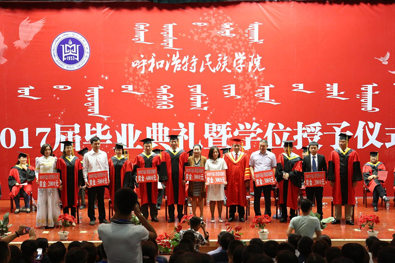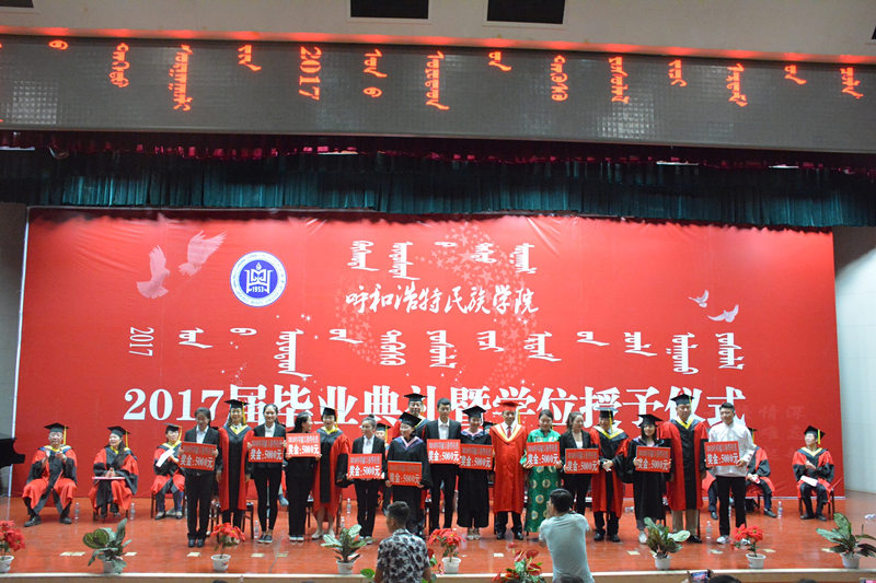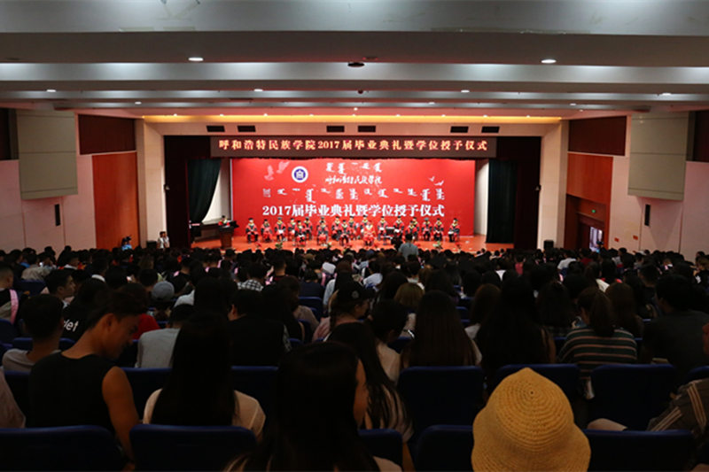 仪式上,教务处副处长胡毕斯哈拉图宣读了学校2017届学生毕业情况;全体学校领导为2017届毕业生颁发了毕业证书。学校学位委员会主任格日乐图院长及主席台领导为获得学士学位的毕业生代表授予学位并行拨穗礼。主席台上的每一位老师与毕业生握手祝贺、毕业快乐、拨穗行礼、合影留念,与同学们简短交流,祝福同学们前程似锦。