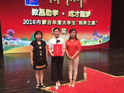 6月16日晚,“敦品励学·成才圆梦”——2016内蒙古年度大学生“桃李之星”颁奖活动在内蒙古大学举行,10名“桃李之星”称号获得者和20名提名奖获得者受到表彰。Beat365外语系赵圆同学荣获提名奖。