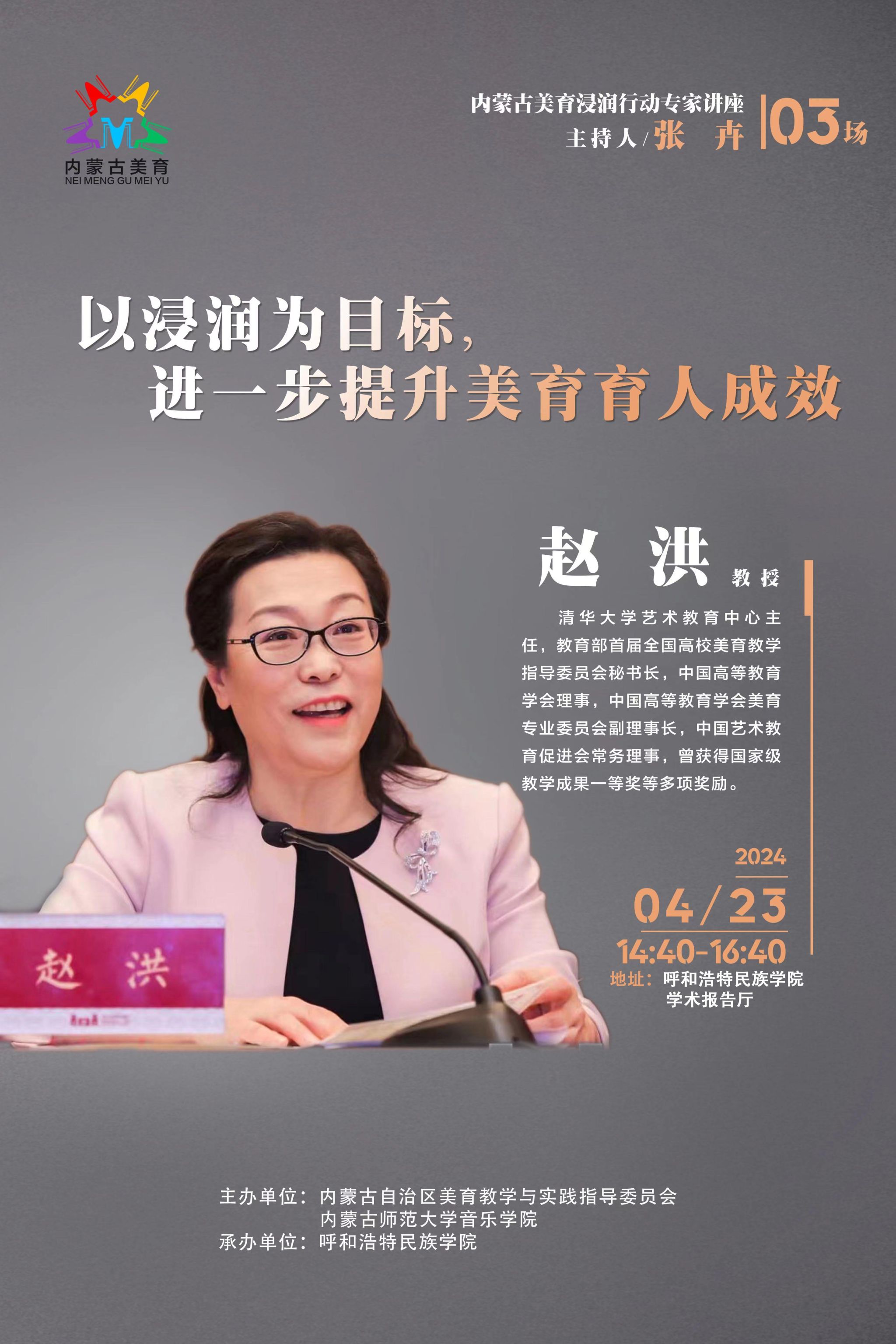 赵洪教授,清华大学艺术教育中心主任,教育部首届全国高校美育教学指导委员会秘书长,中国高等教育学会理事,中国高等教育学会美育专业委员会副理事长,中国艺术教育促进会常务理事,曾获得国家级教学成果一等奖等多项奖励。