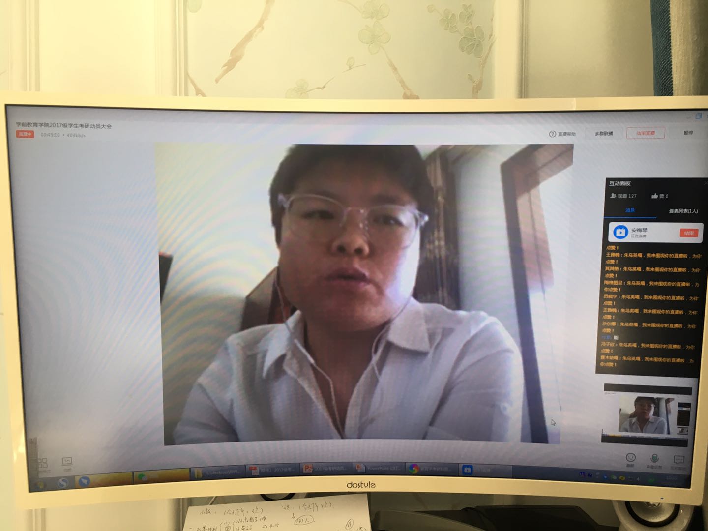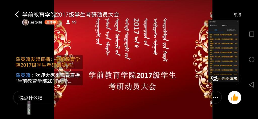 为了推进学校的考研指导工作,提高学生的考研积极主动性,3月13日上午10点,学前教育学院利用线上直播的形式举办了2017级学生考研动员大会。大会由学前教育学院教学科研办公室主任朱乌英嘎主持,邀请到学前教育学院副书记其其格、团总支书记安梅琴等老师进行了考研指导,学生在线参会人数达到130人。