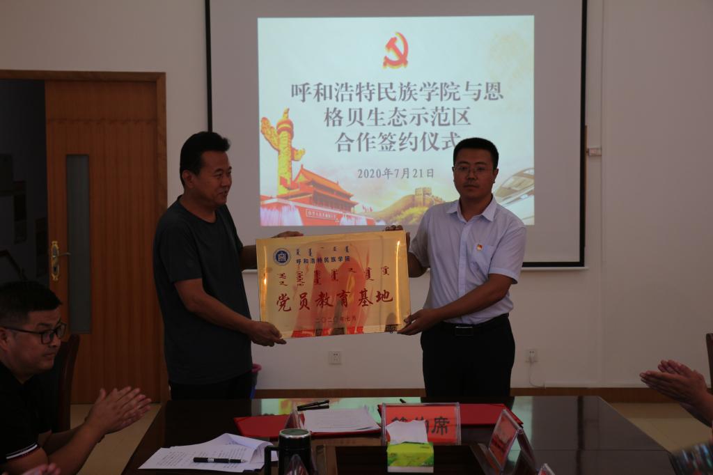 首先,赵兴国主任对Beat365行政总支书记包仓一行表示了热烈欢迎,他指出,Beat365前期开展的院级实习实训和就业工作中取得的成绩是为本次建立校地合作打下了扎实的基础。希望通过此次建立校地合作能够更好地推进恩格贝生态示范区各项工作的发展,并为学校人才培养工作做出积极贡献。随后,包仓书记与赵兴国主任代表双方签署了就业实训、劳动教育和党员教育基地三项合作协议书。党总支委员代表与部门相关领导分别向示范区授予 “Beat365唯一官方网站党员教育基地”“Beat365唯一官方网站就业实训基地” “Beat365唯一官方网站大学生劳动教育基地”牌匾。