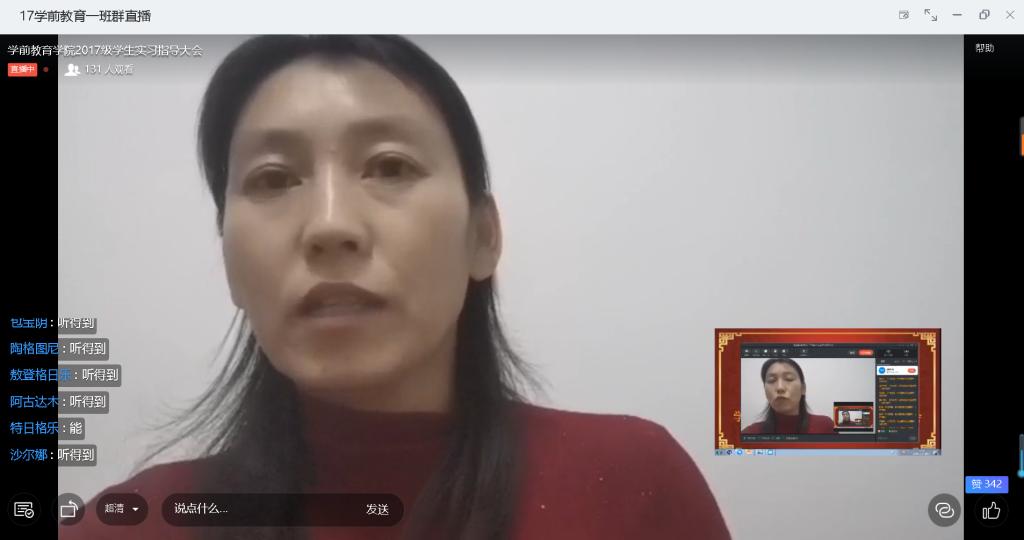 为了加强2017级学前教育专业学生实习实践工作,有效提升指导管理水平,学前教育学院于10月17日晚19时,在线举办了“2017级学生实习工作指导大会”。会议由学前教育学院教学科研办公室主任朱乌英嘎主持,学前教育学院党总支副书记其其格、学前教育实践教研室主任乌日罕、实习指导教师和2017级学前教育专业全体学生参加了本次大会。