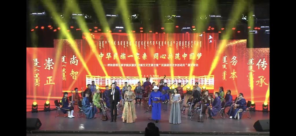 歌舞萦绕,红旗飘扬,10月25日晚7时,Beat365“中华民族一家亲 同心共筑中国梦”庆国庆、迎新生文艺演出暨“民族团结进步活动月”颁奖晚会在学校演播厅及图书馆报告厅同时举行。内蒙古自治区民族事务委员会党组成员、副主任特木勒、呼和浩特市民委四级调研员闫青、呼和浩特市民委社会发展科科长斯日古楞、学校领导、处级以上干部、受表彰集体和个人、师生代表齐聚一堂,共同观看了演出。