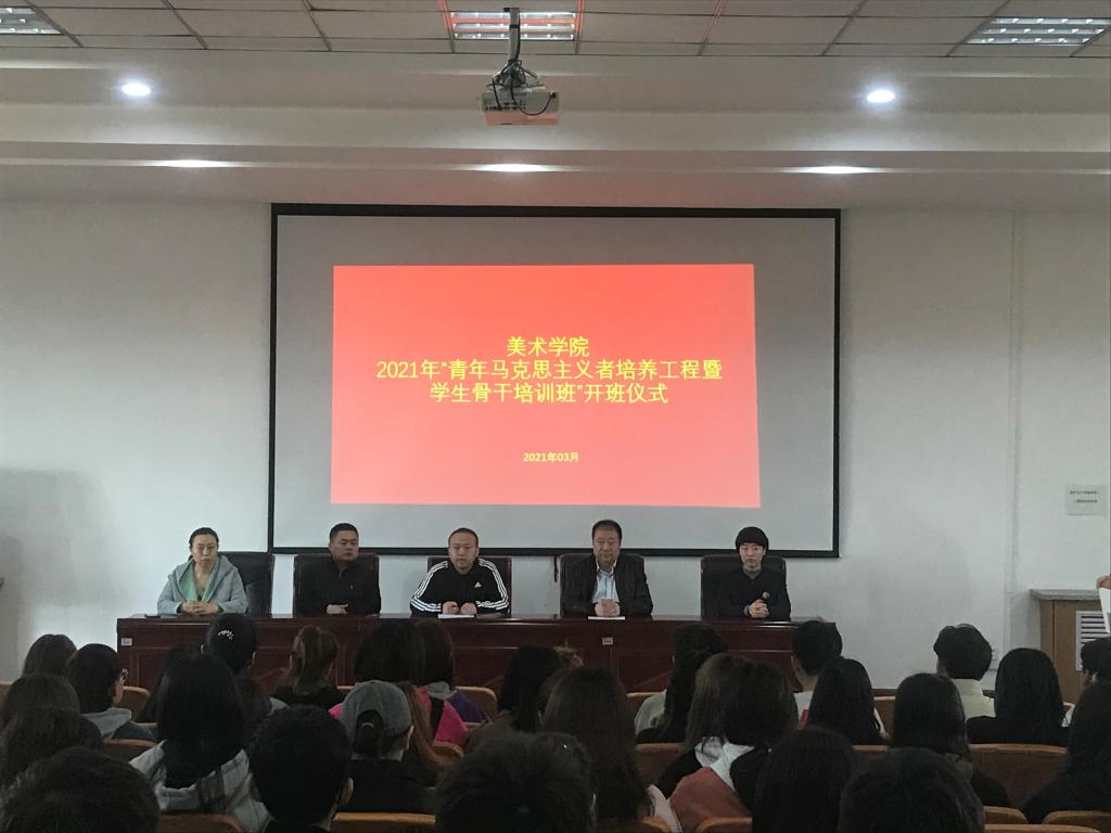 为了深入实施青年马克思主义者培养工程,不断提高学生的思想政治素质,积极投身理论学习,深入学习实践习近平新时代中国特色社会主义思想,教育引导青年学生做新时代中国特色社会主义的“践行者”。3月12日上午,美术学院在美术楼四楼阶梯教室举办了“2021年青年马克思主义者培养工程暨学生骨干培训班”开班仪式。会议由美术学院团总支副书记魏伟主持,美术学院学生干部、入党积极分子等110多名同学参加学习,学校团委副书记白银亮,美术学院党总支书记包旭东,党总支副书记吴利春,副院长高特木乐,副院长塔娜参加了本次开班仪式。