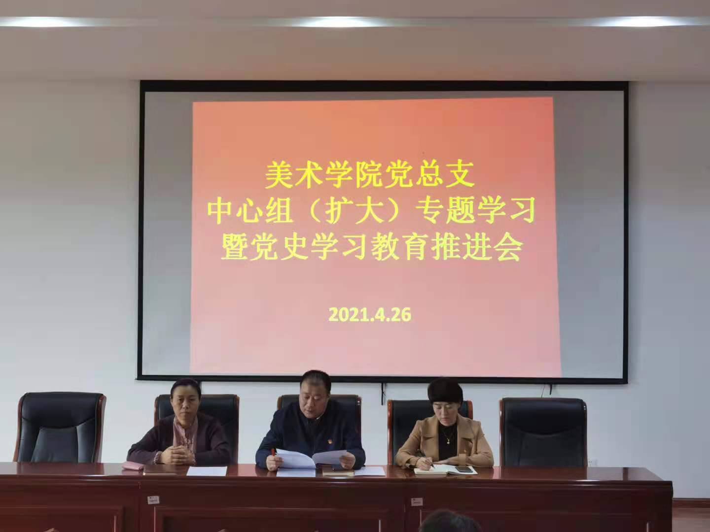 4月26日上午,美术学院在美术楼四楼阶梯教室召开党总支中心组(扩大)学习会暨党史学习教育推进会。会议由党总支书记包旭东主持,副书记吴利春、副院长塔娜以及全体教师参会。