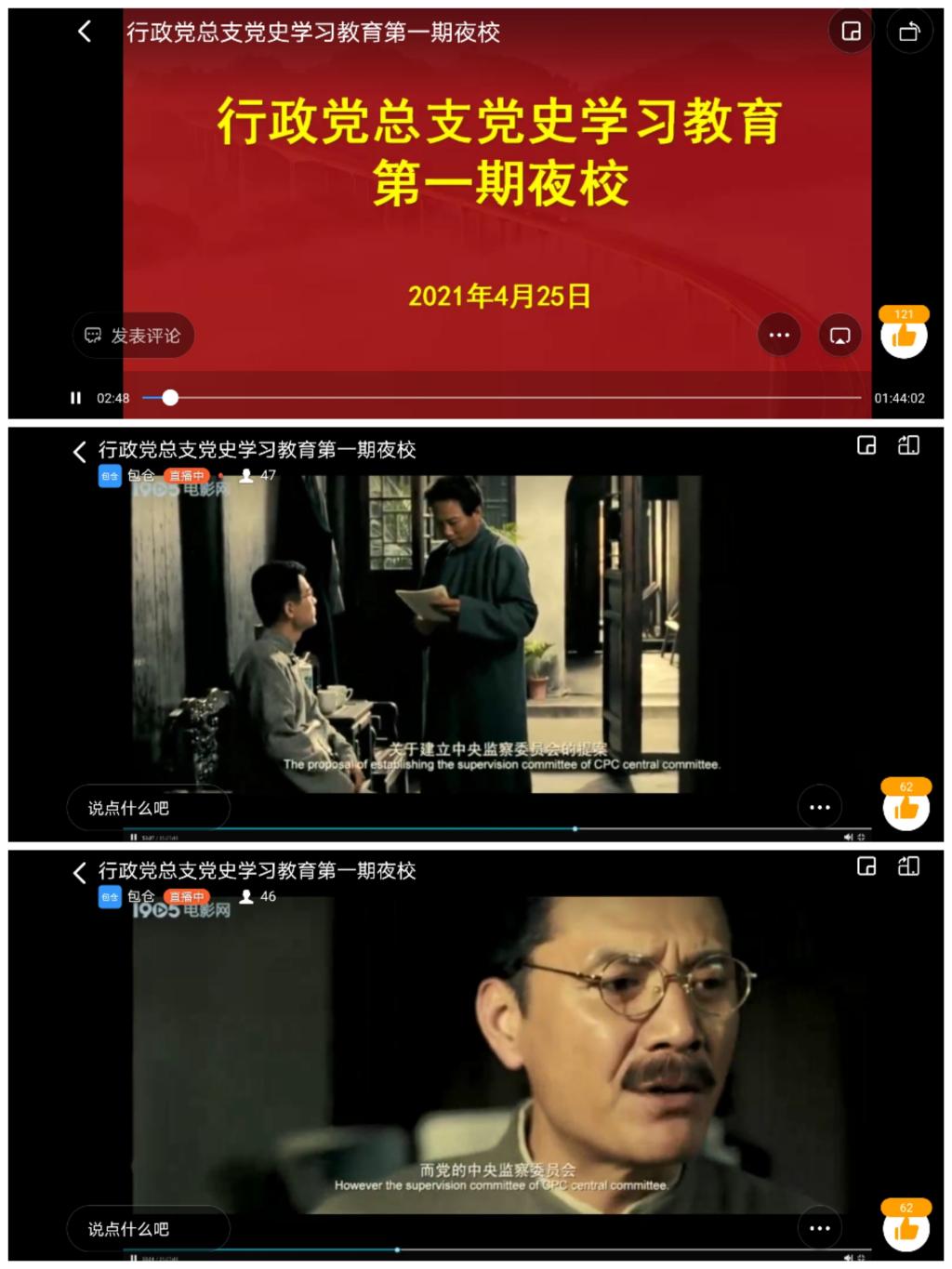 4月25日晚上7时40分,通过钉钉直播形式,举办了党总支党史学习教育第一期夜校,向全体党员和处级干部播放了党史爱国主义影片《忠诚与背叛》,影片通过真实感人的故事、丰满生动的人物形象,谱写了第一届中央监察委员会成立、十名监察委员忠于职守、为党履职的光辉篇章,着力塑造了中央监察委员会第一任主席王荷波、副主席杨匏安的英雄形象,热情讴歌了老一辈党的纪监干部威武不屈、刚正不阿、忠于革命、视死如归的大无畏革命精神。使广大党员和干部收到了心灵的洗礼和进行了很好地对党忠诚、对国家忠诚、对人民忠诚的党性教育。