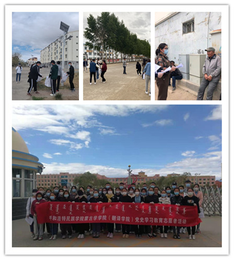 为推进党史学习教育深入开展,蒙古学学院(翻译学学院)积极号召各类学生群体参加形式多样的学习活动,5月10日-5月27日,在锡林郭勒盟东乌珠穆沁旗蒙古族第二小学、二连浩特蒙古族小学、扎赉特旗呼尔勒中心学校实习实训的实习学生积极参加实习基地党组织开展的“学党史、颂党恩、跟党走”系列主题教育志愿者系列活动。