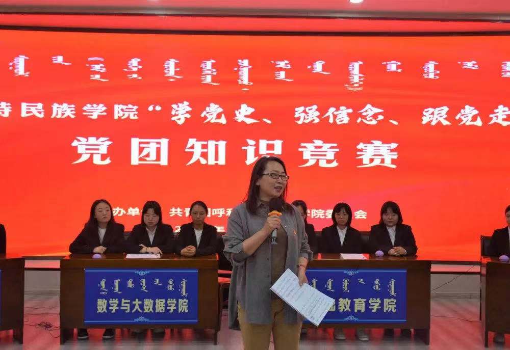为深入开展党史学习教育,引导广大青年学史明理、学史增信、学史崇德、学史力行,于5月27日晚,校团委在图书馆一楼报告厅举办了“学党史、强信念、跟党走”主题党团知识竞赛决赛。大赛邀请到计算机学院党总支书记雪梅、学生工作部副部长白永泉、马克思主义学院哈斯木仁教授、美术学院党总支副书记吴利春、团委副书记白银亮担任评委。