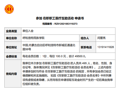 教职工医疗互助工作是一项坚持常态投入聚沙成塔、帮扶重病职工共渡难关的工作。始终牢记“无病我帮人,有病人帮我”的宗旨,团结工人阶级最强大的力量。为充分体现学校对教职工的关爱,今年学校工会继续为495名教职工统一办理职工医疗互助保险,教职工个人缴纳50元,工会缴纳40元,自治区总工会补助10元。互助期每期为1年,自2021年6月10日零时起至2022年6月10日二十四时止。
