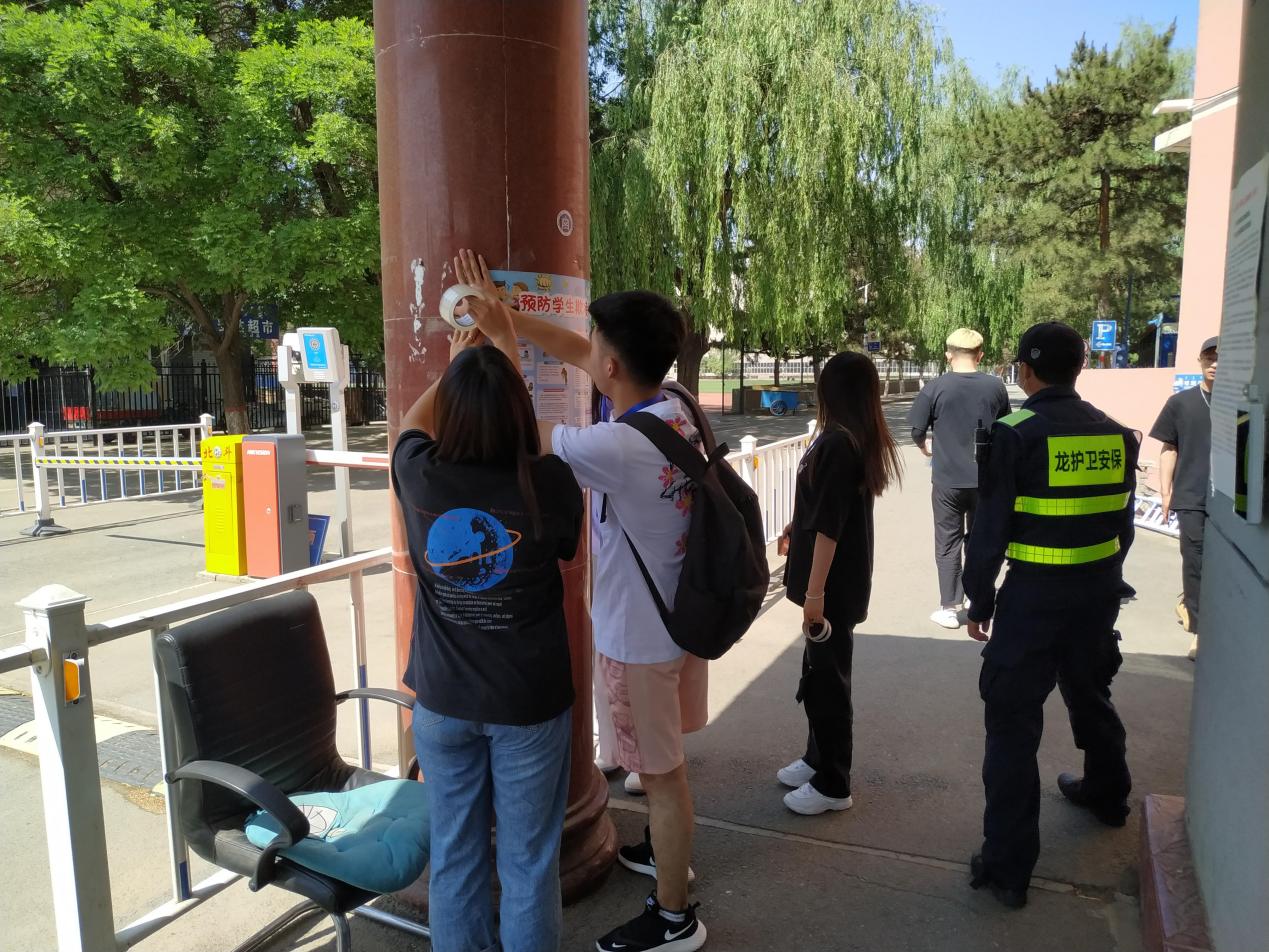 同日,为预防校园欺凌、霸凌事件的发生,号召学生远离校园暴力,共建和谐、平安、阳光校园。保卫处召集学生校卫队,在学校各个公寓门前张贴预防校园欺凌霸凌安全教育宣传海报14张,发放相关宣传资料100余份。